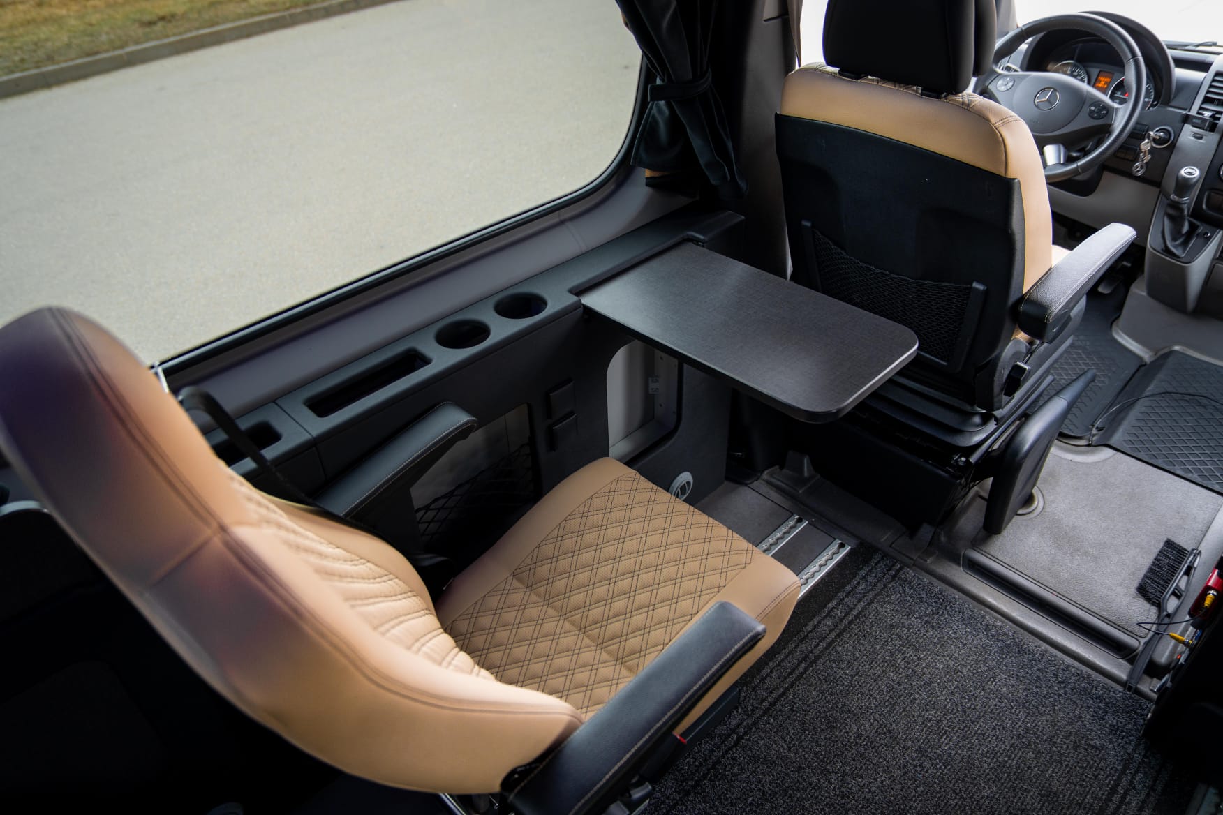 A premium mobile base for clients, production and/or directors – compact, comfortable, and fully equipped. Built as a professional Video-Village, with high end wiring that can be quickly connected for live video. Can also be used as a vehicle driving behind the shooting happening on the roads.